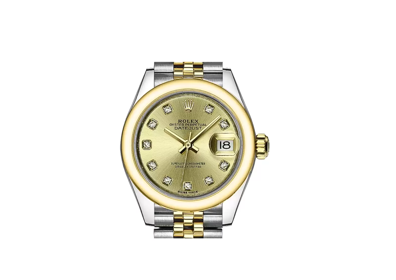 Crafted with meticulous attention to detail, this watch boasts a champagne dial adorned with diamond hour markers, exuding sophistication and refinement. The polished solid 18k yellow gold domed bezel adds a touch of opulence to the overall design.