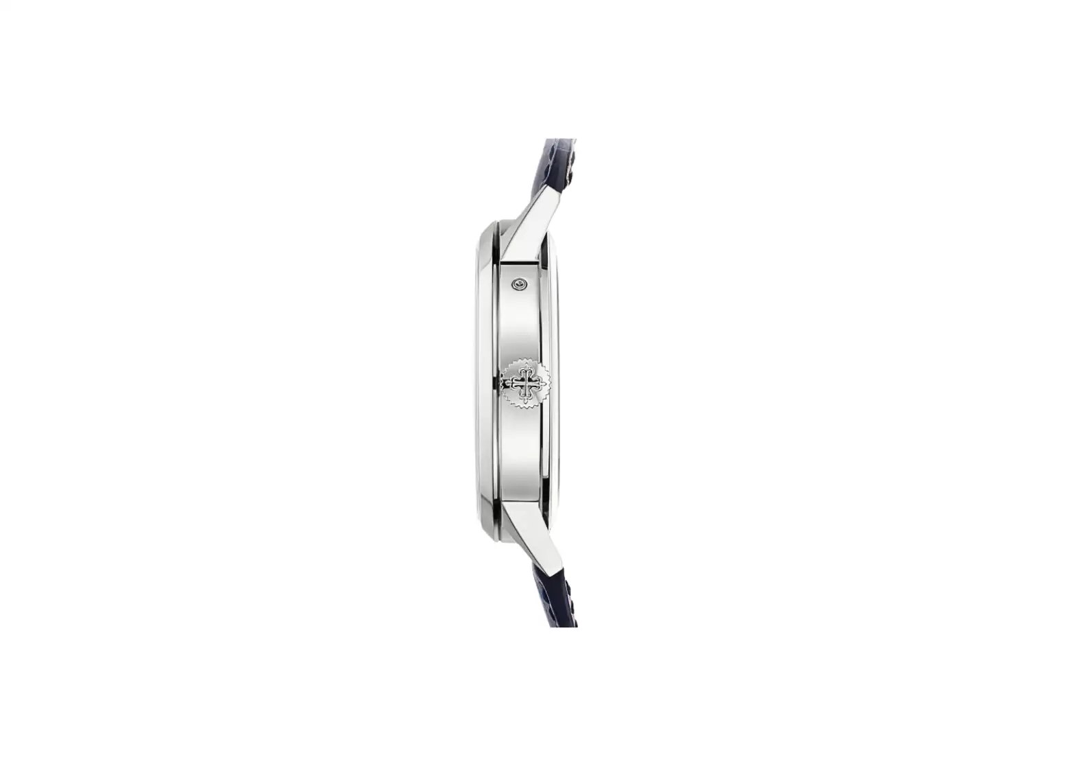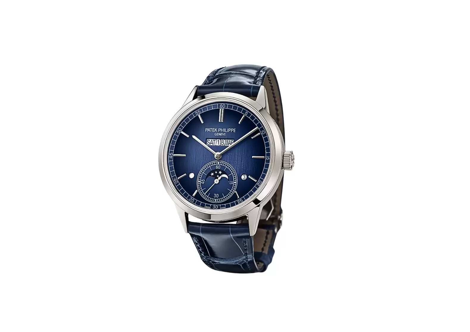 Encased in an elegant platinum case, the Pre-owned Patek Philippe 5236P-001 features a vertical satin-finished blue dial with a captivating black-gradient rim. The dial is adorned with gold applied hour markers, further enhancing its luxurious appeal.