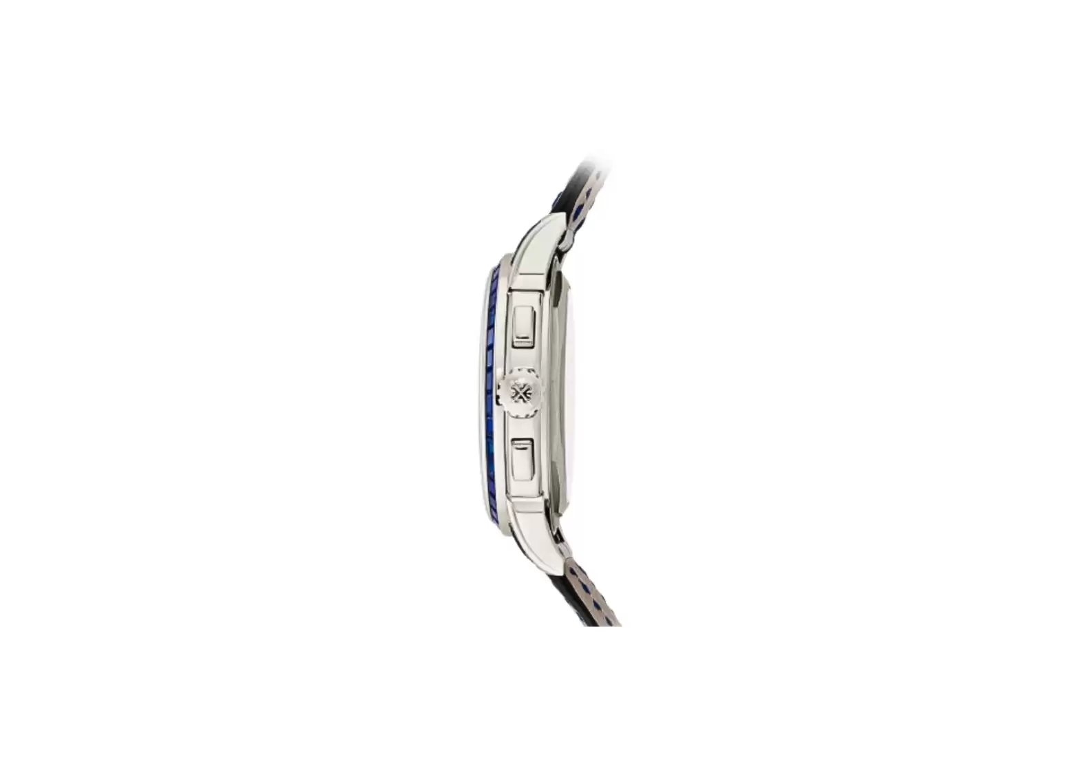 Completing the ensemble is the alligator leather strap with square scales, hand-stitched to perfection. The shiny black strap exudes sophistication, while the fold-over clasp set with sapphires adds a touch of glamour.