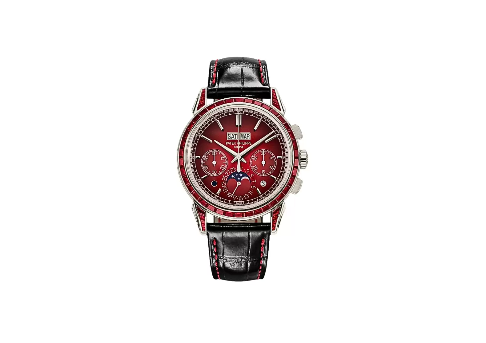 The gemsetting of the Patek Philippe 5271/12P-010 is truly remarkable. The bezel and lugs are adorned with 58 baguette-cut rubies, totaling 4.11 carats, while the fold-over clasp features an additional 22 baguette-cut rubies, totaling 1.14 carats. The total of 80 baguette-cut rubies adds a luxurious touch to this already exceptional timepiece.