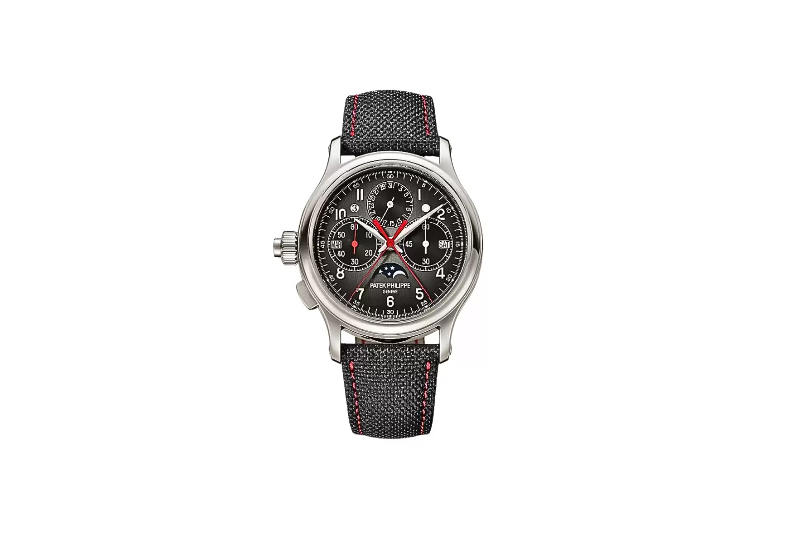 This mechanical manually wound watch features various complications, including a split-seconds monopusher chronograph, a 60-minute counter, a perpetual calendar with day, month, leap year, and day/night indication displayed in apertures, a date indicated by hand, moon phases, and small seconds.