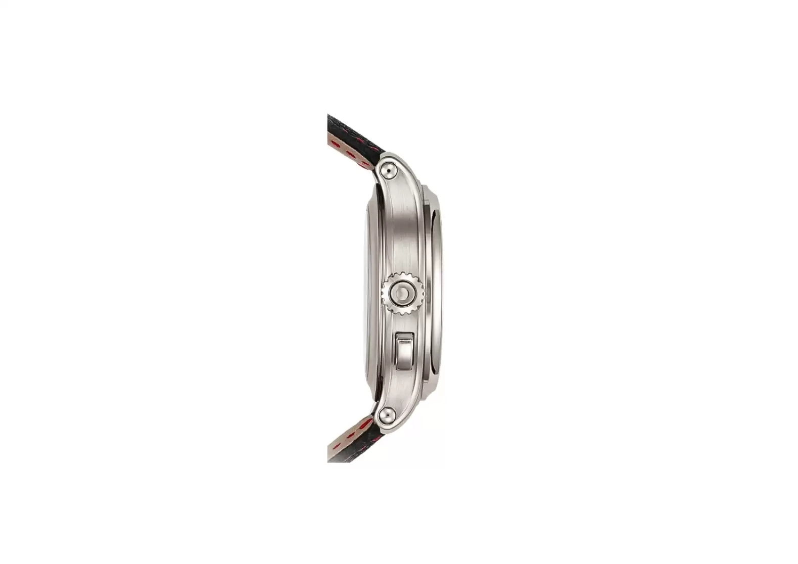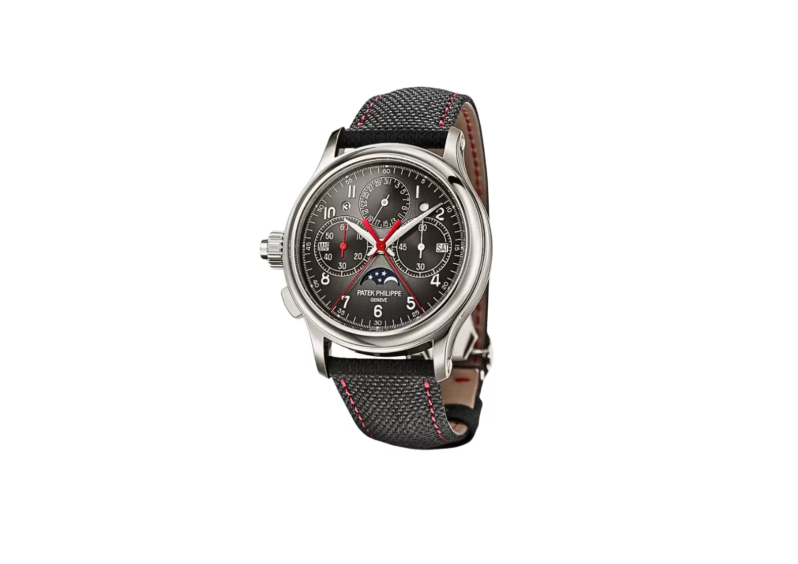 The charcoal-colored dial features a black gradation and red varnished chronograph hands, giving it a sporty and contemporary look. This stylish design is further complemented by the black calfskin strap, embossed with a fabric pattern, and a fold-over clasp.