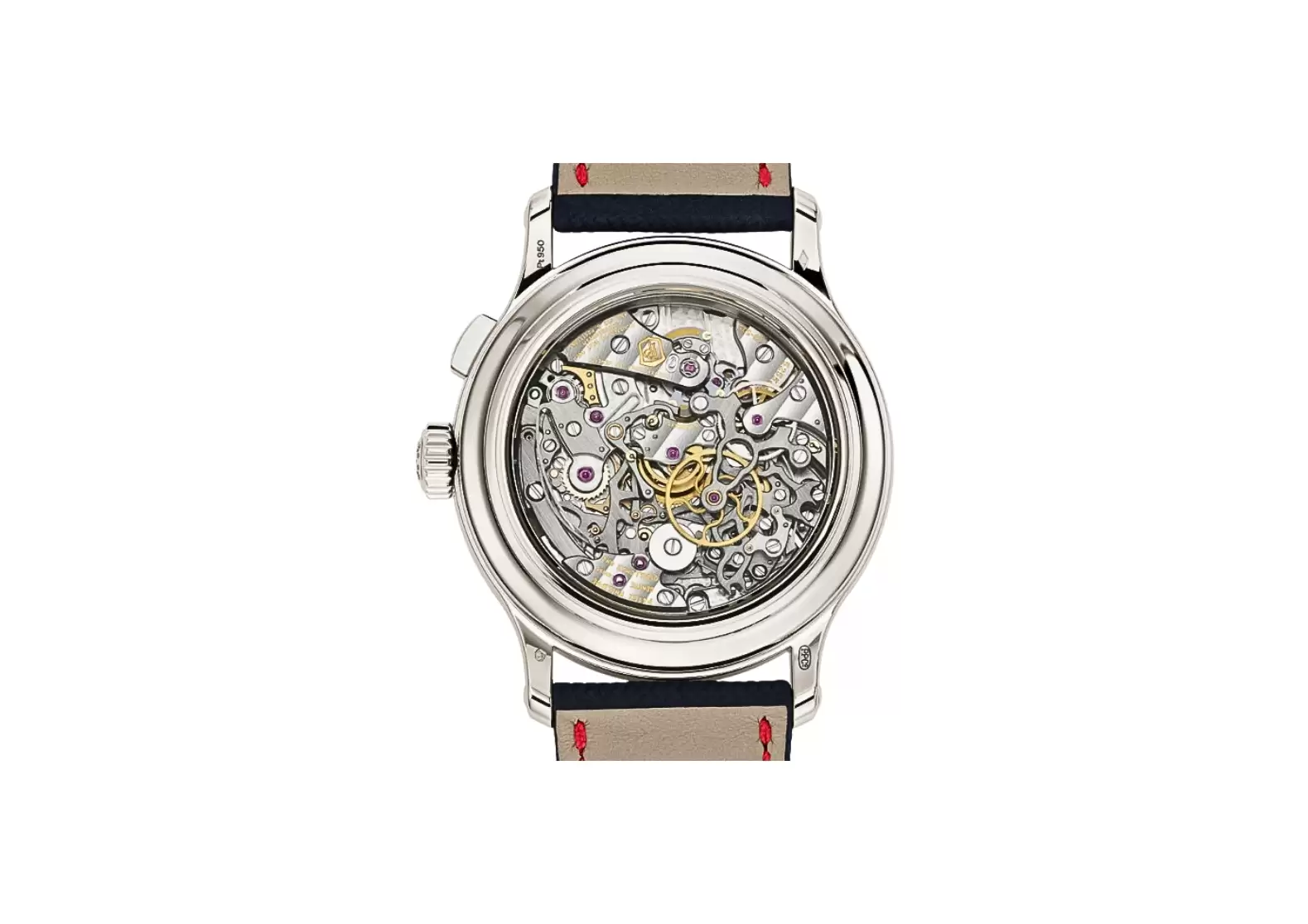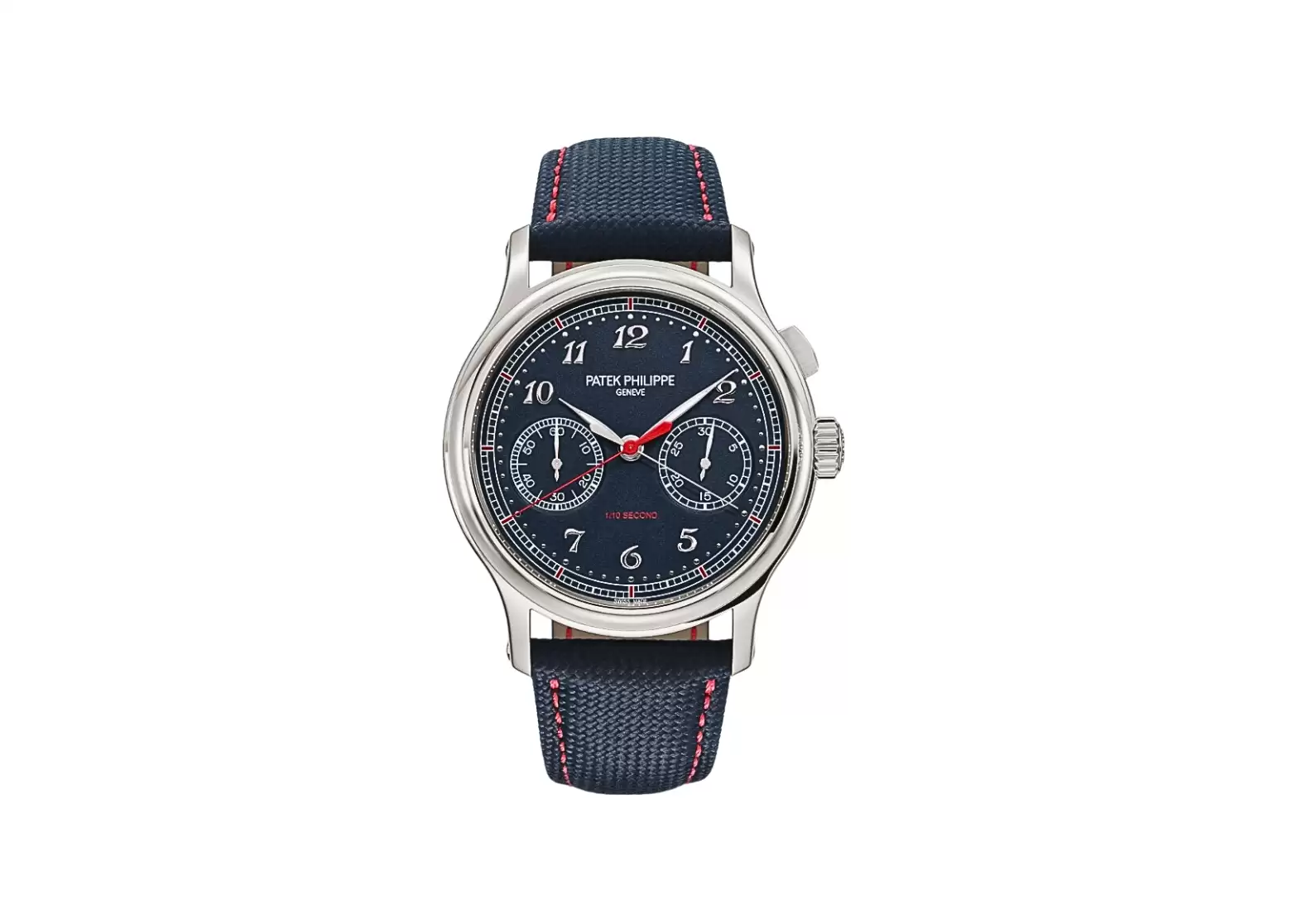 Completing the ensemble is a calfskin strap, embossed with a fabric pattern and hand-stitched in a captivating navy blue hue. The fold-over clasp ensures a secure and comfortable fit, allowing you to wear this exceptional timepiece with confidence.