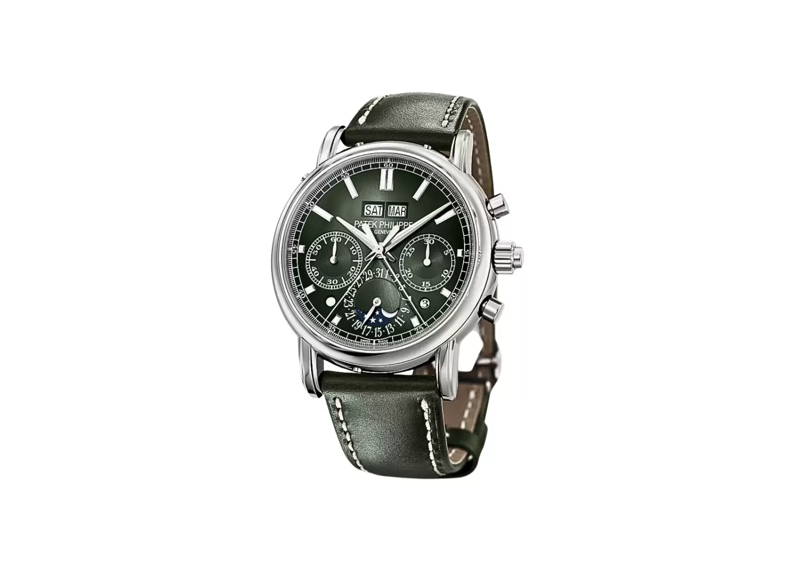 Completing the look is a calfskin strap in a shiny olive green shade, hand-stitched for added quality. The fold-over clasp ensures a secure and comfortable fit.
