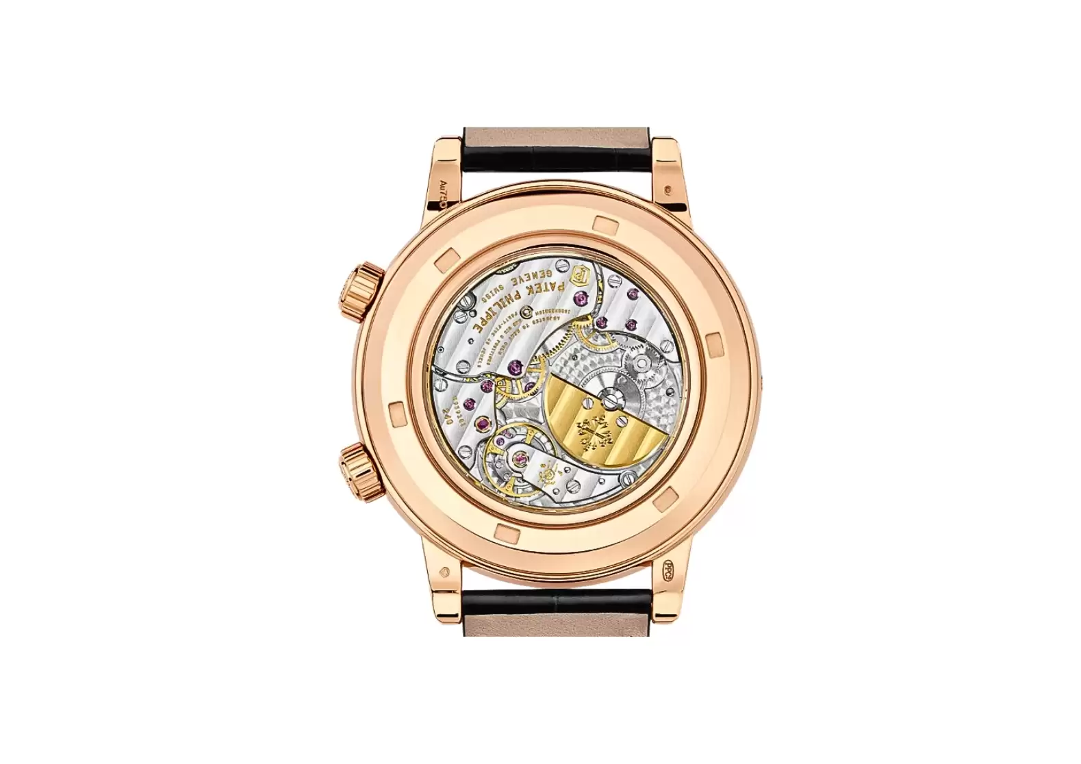 The dial of the Pre-owned Patek Philippe 6104R-001 is crafted from transparent sapphire crystal, allowing for a clear view of the sky chart and the magnificent Milky Way. The sky background and moon phases are presented on black sapphire-crystal disks, adding a touch of sophistication to the overall design.