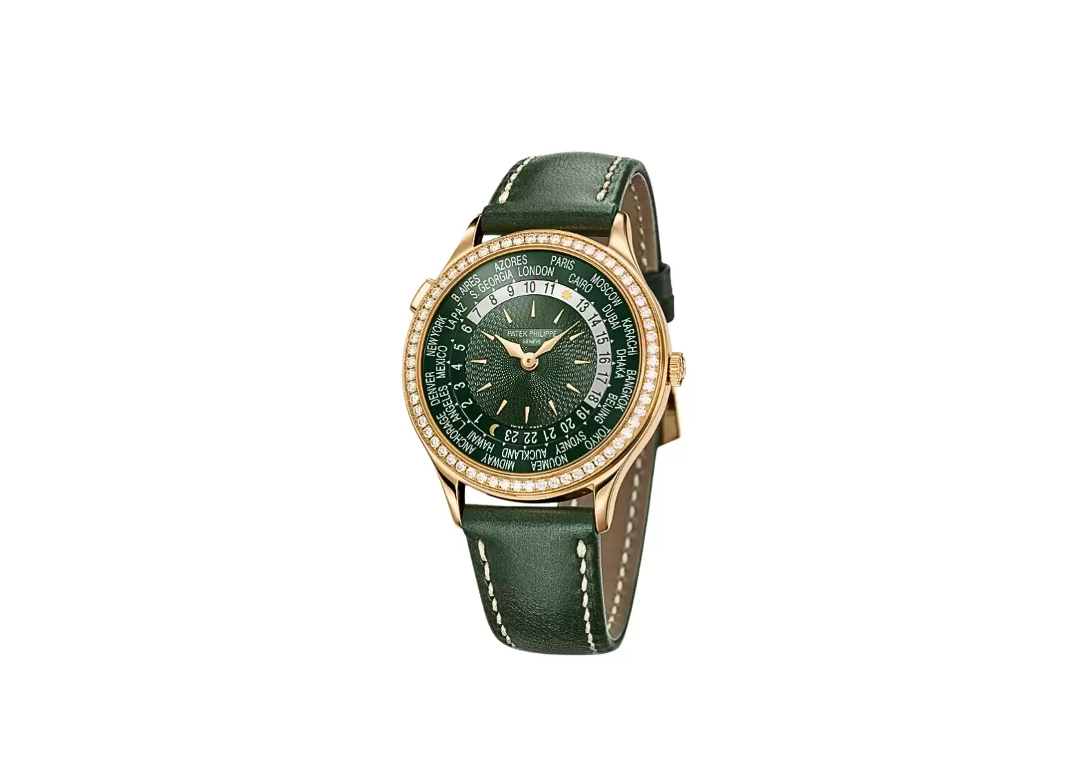 The dial of this remarkable watch showcases the exceptional Rare Craftsmanship skills of Patek Philippe, featuring a finely hand-guilloched basketweave motif at its center. The captivating olive green shade is also reflected on the city disk, where the white-printed names of the cities stand out in an incredibly legible manner.