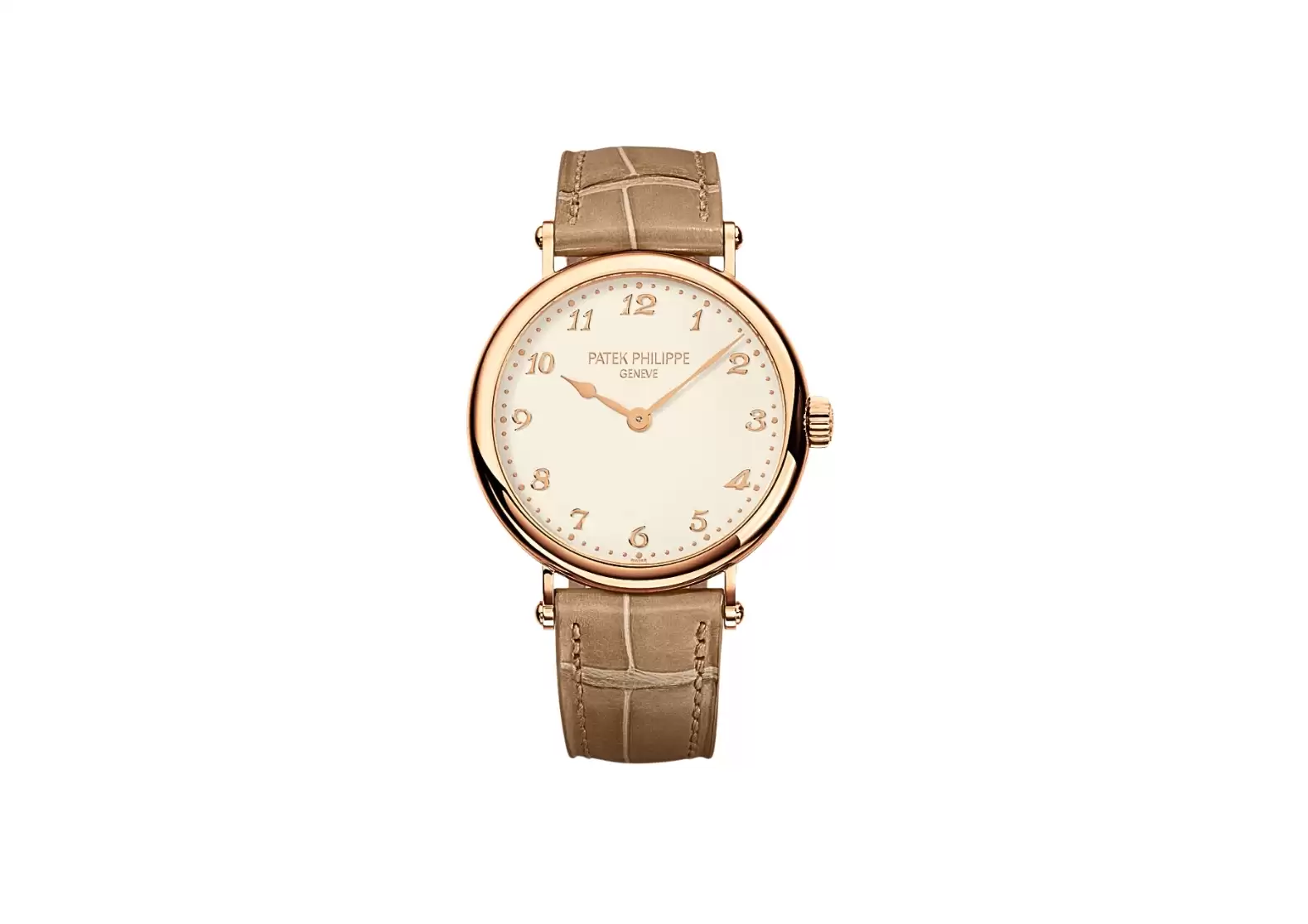 The strap of the Patek Philippe 7200R-001 is crafted from alligator leather, featuring square scales and a hand-stitched design. The matt pearly beige color adds a subtle touch of sophistication. Securing the watch is a prong buckle, ensuring a secure and comfortable fit on the wrist.