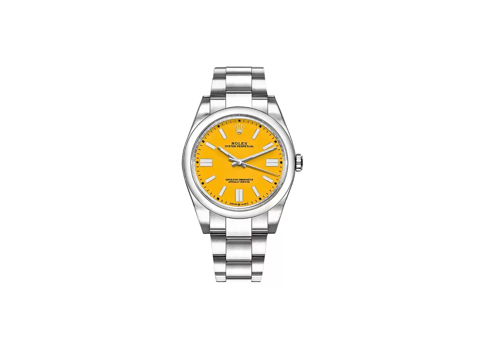 Introducing the Pre-owned Rolex Oyster Perpetual 41 Yellow Dial Oystersteel Men's Watch 124300-0004. This exquisite timepiece boasts a stunning yellow dial with index hour markers, creating a striking and sophisticated look. Crafted with precision and attention to detail, this watch is Swiss made and comes with manufacturer serial numbers, guaranteeing its authenticity.