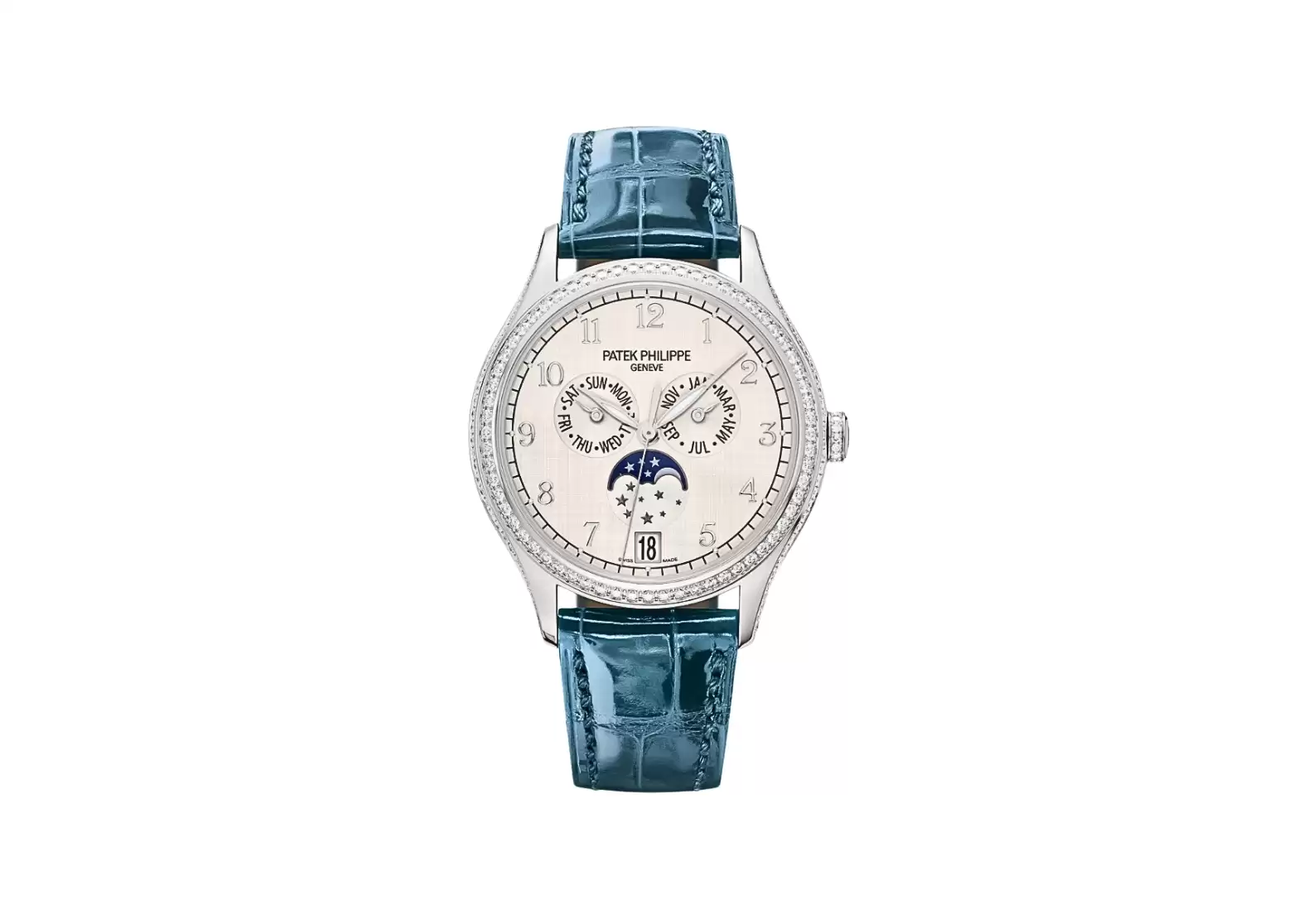 Completing the ensemble is an alligator strap with square scales, hand-stitched to perfection in a shiny peacock blue shade. The strap is secured with a prong buckle, ensuring a comfortable and secure fit on your wrist.