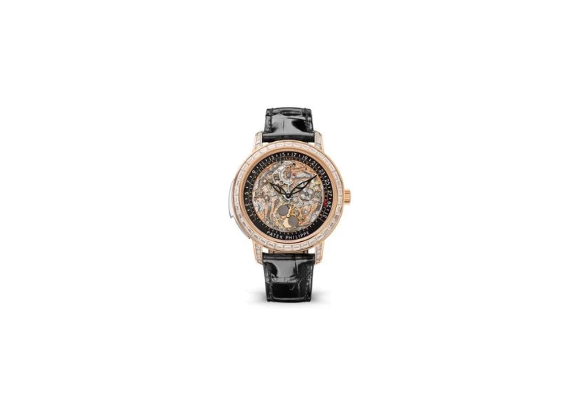 A new rose gold version of the Reference 5304 self-winding Grand Complication with minute repeater and retrograde perpetual calendar is reinvented as a miracle of transparency, with 80 baguette-cut diamonds (~6.22 cts) enhancing the bezel, lugs, and fold-over clasp. The clever sapphire disk calendar display mechanism is emphasized by this shimmering touch. The off-center rose gold mini-rotor visible through the transparent case back echoes the "leaf" motif carved on the white gold inserts gracing the case's sides.