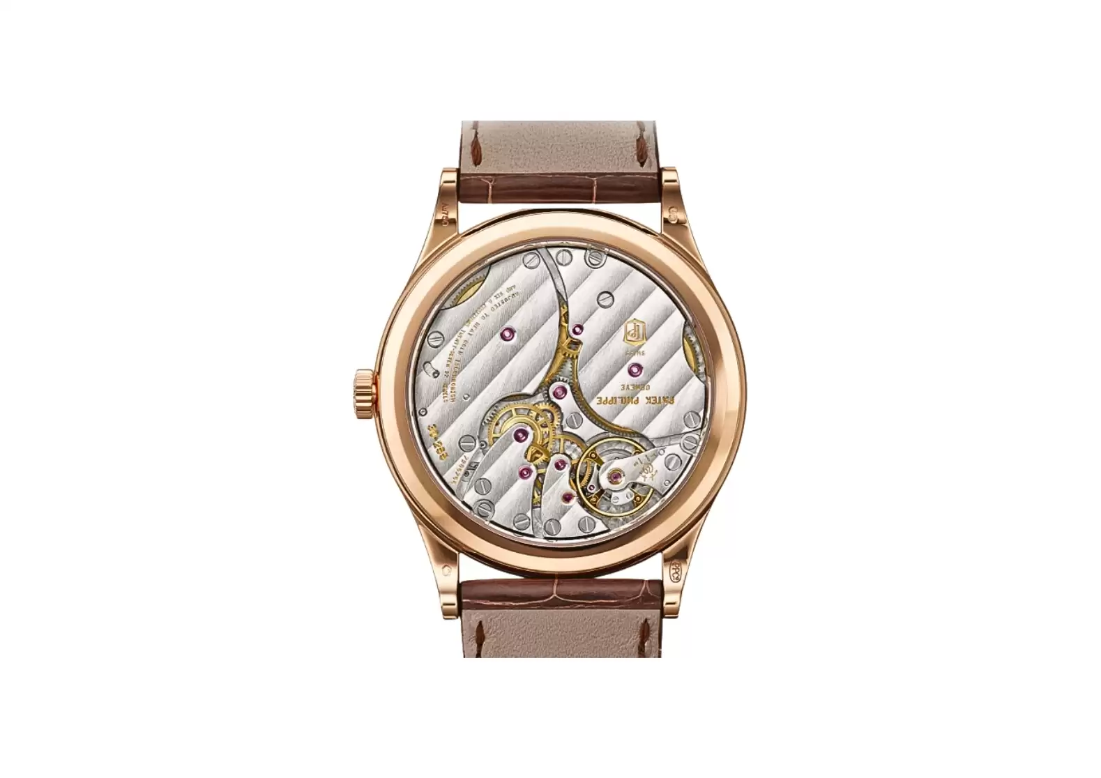 The silvery grained dial is adorned with gold applied hour markers, further enhancing the luxurious appeal of this timepiece. The rose gold case features a bezel guilloched with a hobnail pattern, adding a touch of texture and visual interest. The sapphire crystal case back allows you to admire the intricate inner workings of the watch.