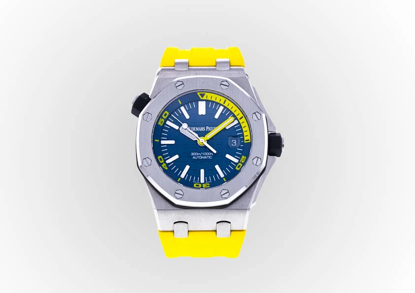 DescriptionThe most important idea of this offshore diver is the 42mm stainless steel case, 14.1mm thick, blue rubber-clad screw-locked crown, glareproofed sapphire crystal, blue dial with Méga Tapisserie" pattern, white gold applied hour-markers and Royal Oak hands with luminescent coating, blue rotating inner bezel with diving scale, and zone from 60 to 15 minutes in yellow. |